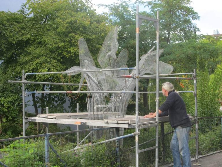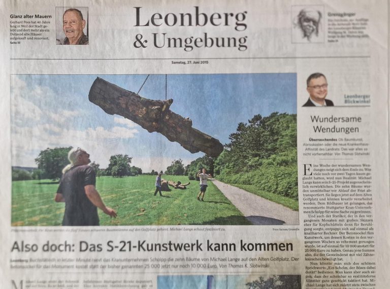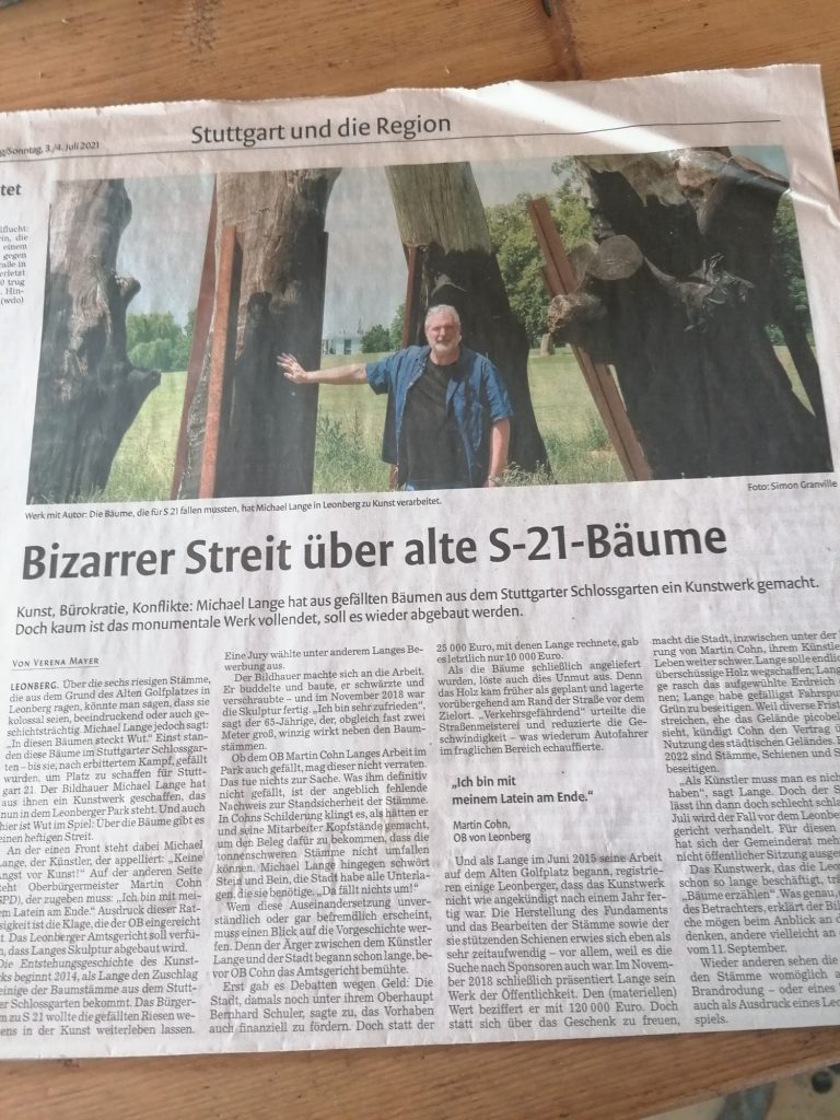 Private Kunst wirkt auch in den öffentlichen raum hinein. Gut sichtabr und am Samstagabend enthüllt, steht die von Michael Lange kreierte und imposante Skulptur aus Teilen einer Kiefer in einem Garten an der Bahnhofstraße- ein Blickfang für Passanten und Autofahrer